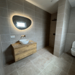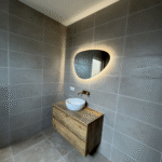 Een van de centrale elementen van de badkamer is het op maat gemaakte zwevende houten badmeubel. Ontworpen om zachtjes te contrasteren met de koelere steentinten van de tegels, brengt de warme houten afwerking evenwicht en organische zachtheid in de ruimte.