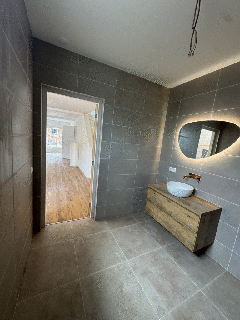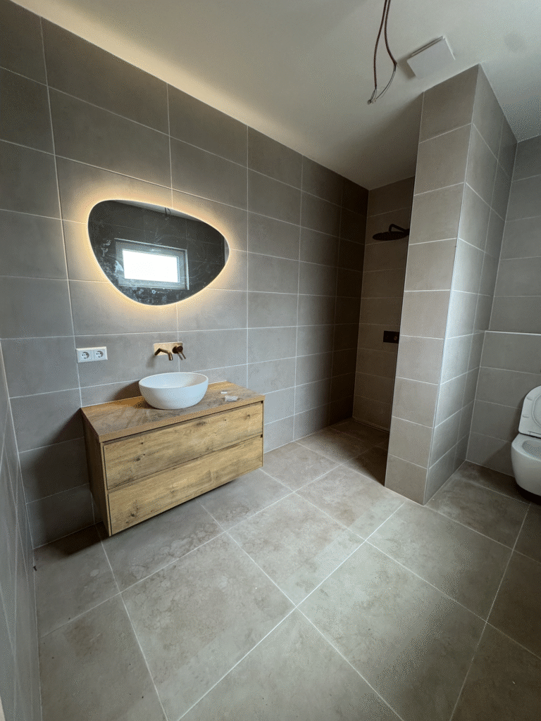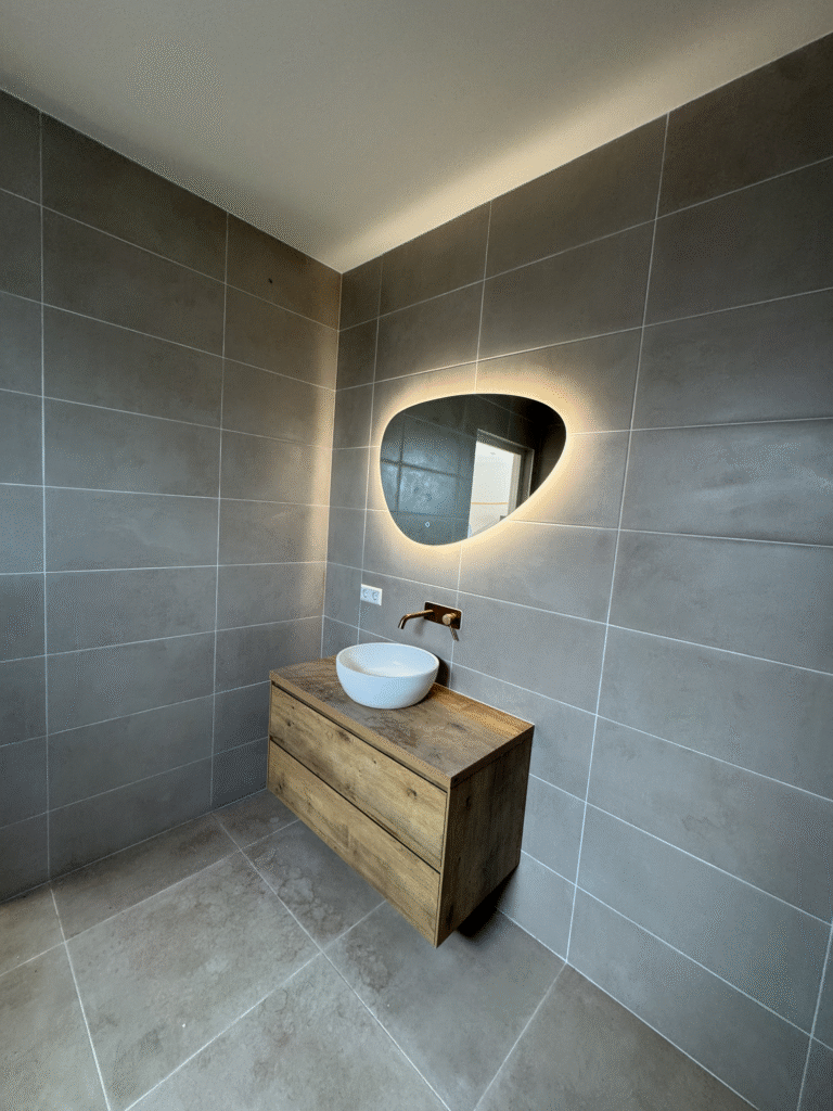 Vanaf het begin vroeg de klant om een rustgevende, minimalistische ruimte opgebouwd rond aardetinten, geometrische helderheid en duurzame, onderhoudsarme materialen. De renovatie was binnen drie weken klaar en resulteerde in een volledig vernieuwde badkamer die moderne eenvoud combineert met hoogwaardig vakmanschap.