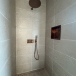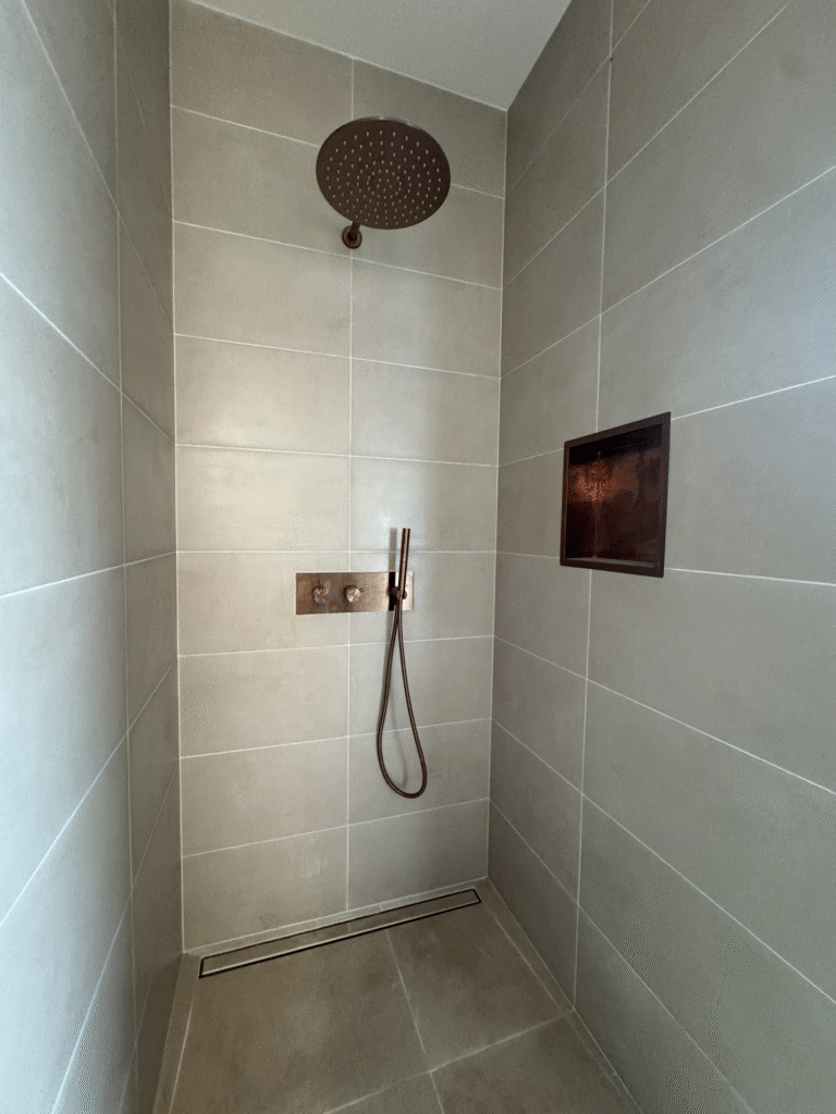 Het gebruik van bronzen armaturen creëert continuïteit met de wastafelkraan, terwijl de strakke geometrie van de douchenis de minimalistische esthetiek versterkt. De nis biedt praktische opbergruimte zonder het visuele ritme van de wandoppervlakken te verstoren.