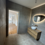 Verlichting werd ontworpen als een belangrijk onderdeel van het project. De uniek gevormde spiegel met achtergrondverlichting creëert een zachte, sfeervolle gloed die diepte toevoegt zonder het minimalistische interieur te overweldigen. De organische vorm breekt de lineaire geometrie van de tegels, introduceert een subtiel artistiek accent en verbetert de algehele visuele balans.